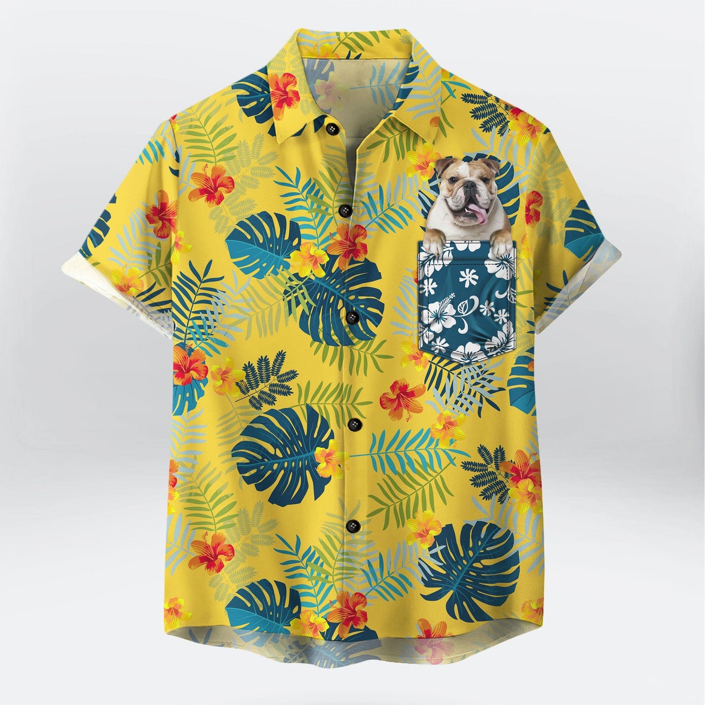 Custom Hawaiian Shirt With Pet Face | Personalized Gift For Pet Lovers | Tropical Summer Botanical Pattern Yellow Color Aloha Shirt With Pocket