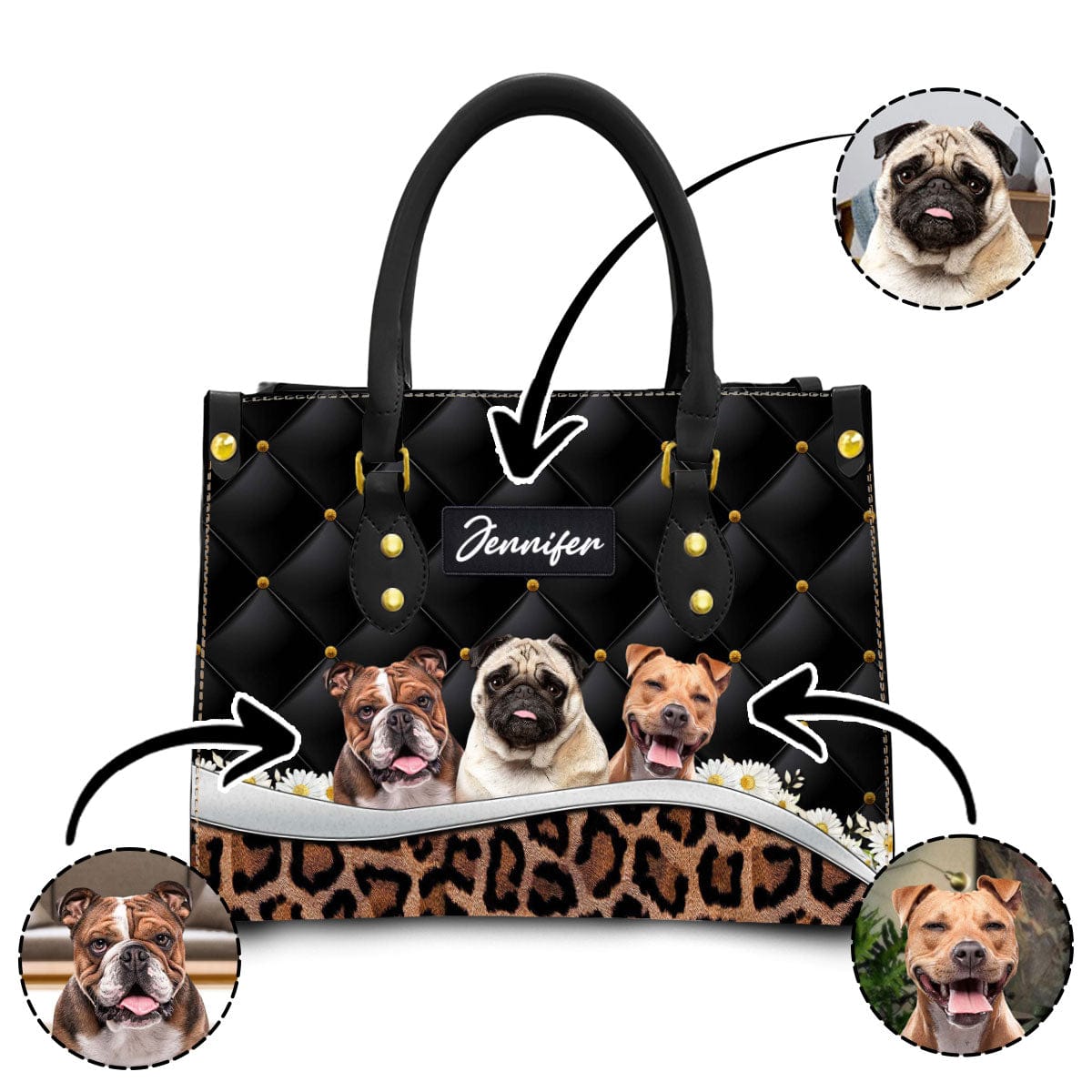 Custom Leather HandBag With Pet Photo | Gift For Pet Mom | Abstract Upholstery Daisy & Leopard Style Charcoal Black Color